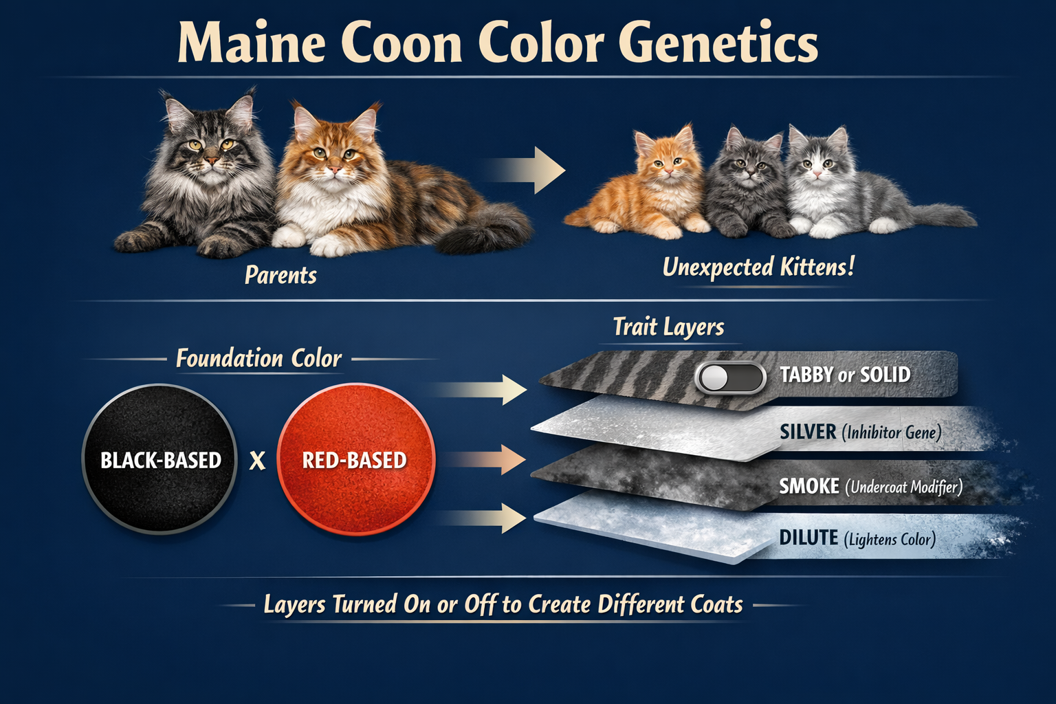 Every Maine Coon kitten inherits genetic information from both parents. That part is simple. What is not always obvious is that many coat traits are recessive, sex linked, or dependent on combinations of genes that do not always show visually in the parents.