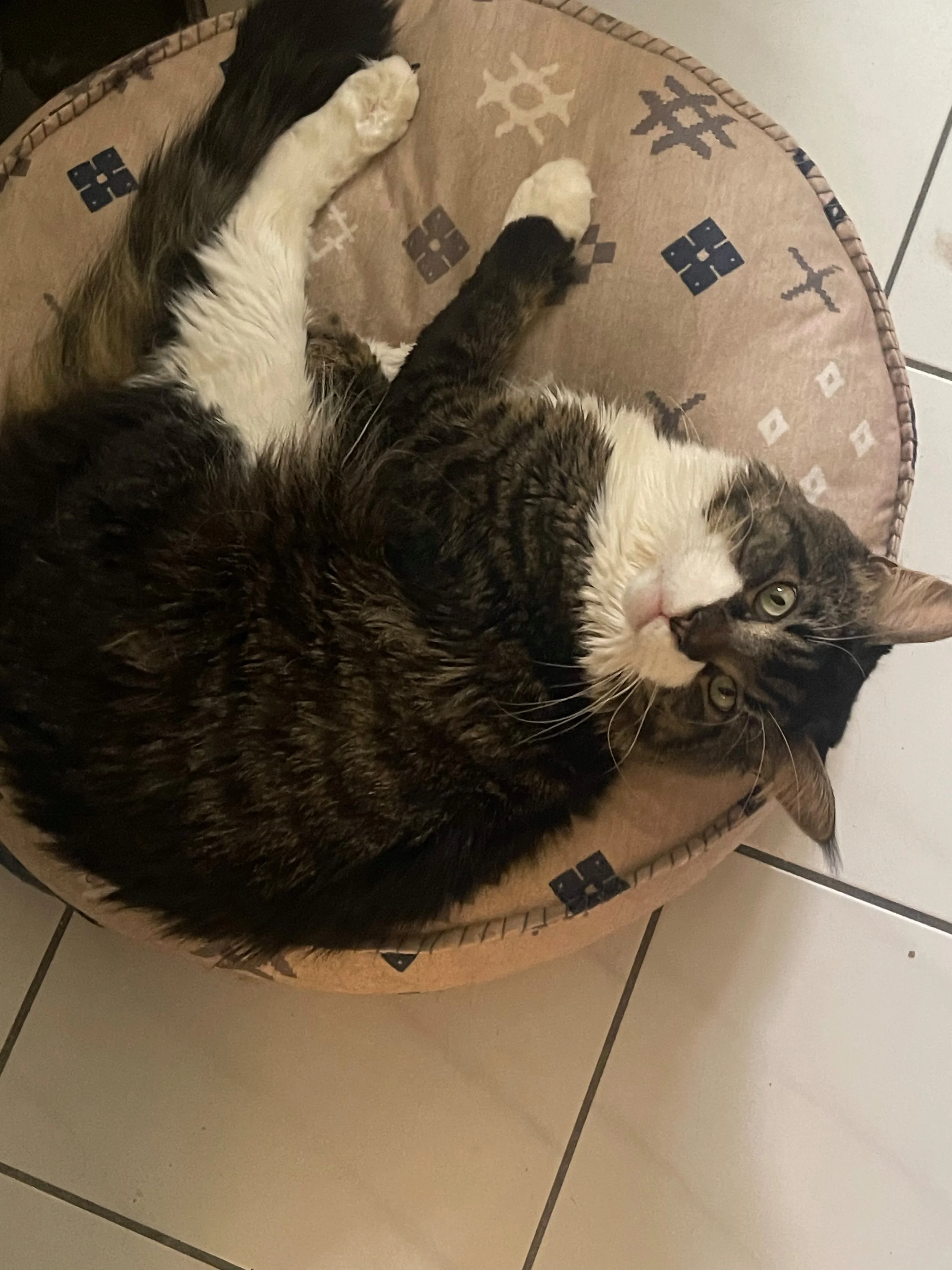 Rajah came all the way from Russia. He is a very very sweet gentle boy. He currently weighs 23 lbs so about three gallons of milk in comparison. He is currently two years old so I imagine he still has some growing to do. He loves to chase the lizards out on my patio and as you can tell loves his floor pillows.