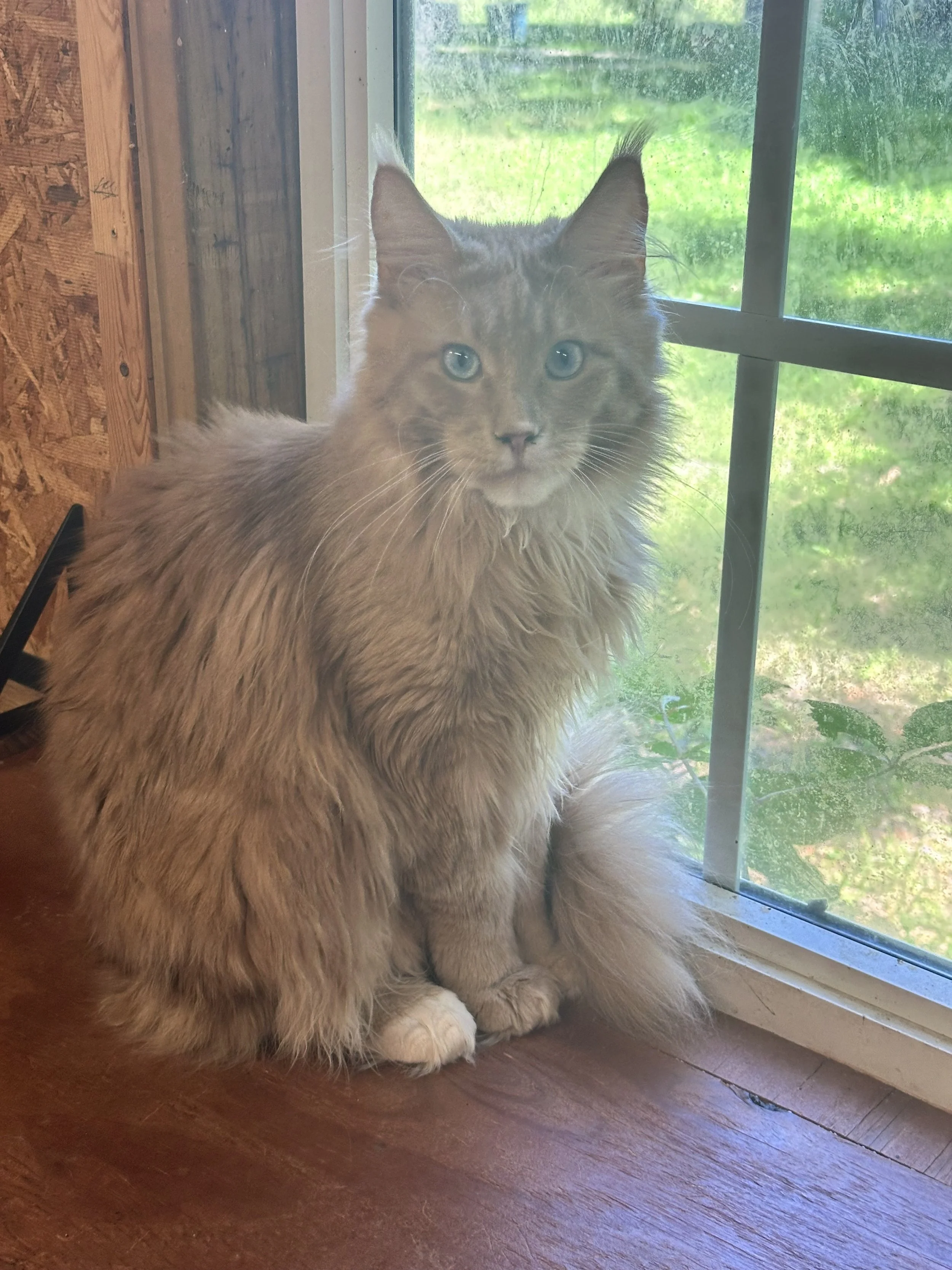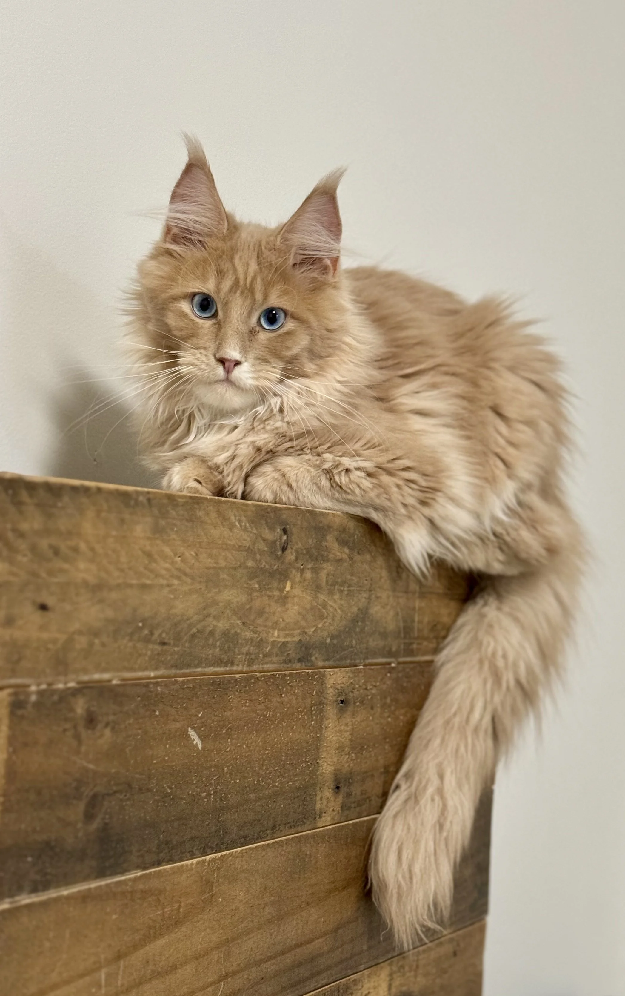 Cobalt is his name and I am sure its not hard to see why. He is a cream and has the blue eye trait that is not common in Maine Coons. He loves to spend time sunbathing or hanging out in front of the windows. We are excited to have him in our breeding program and to see his offspring in 2025.
